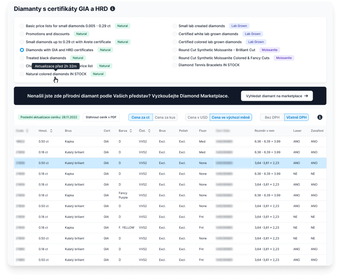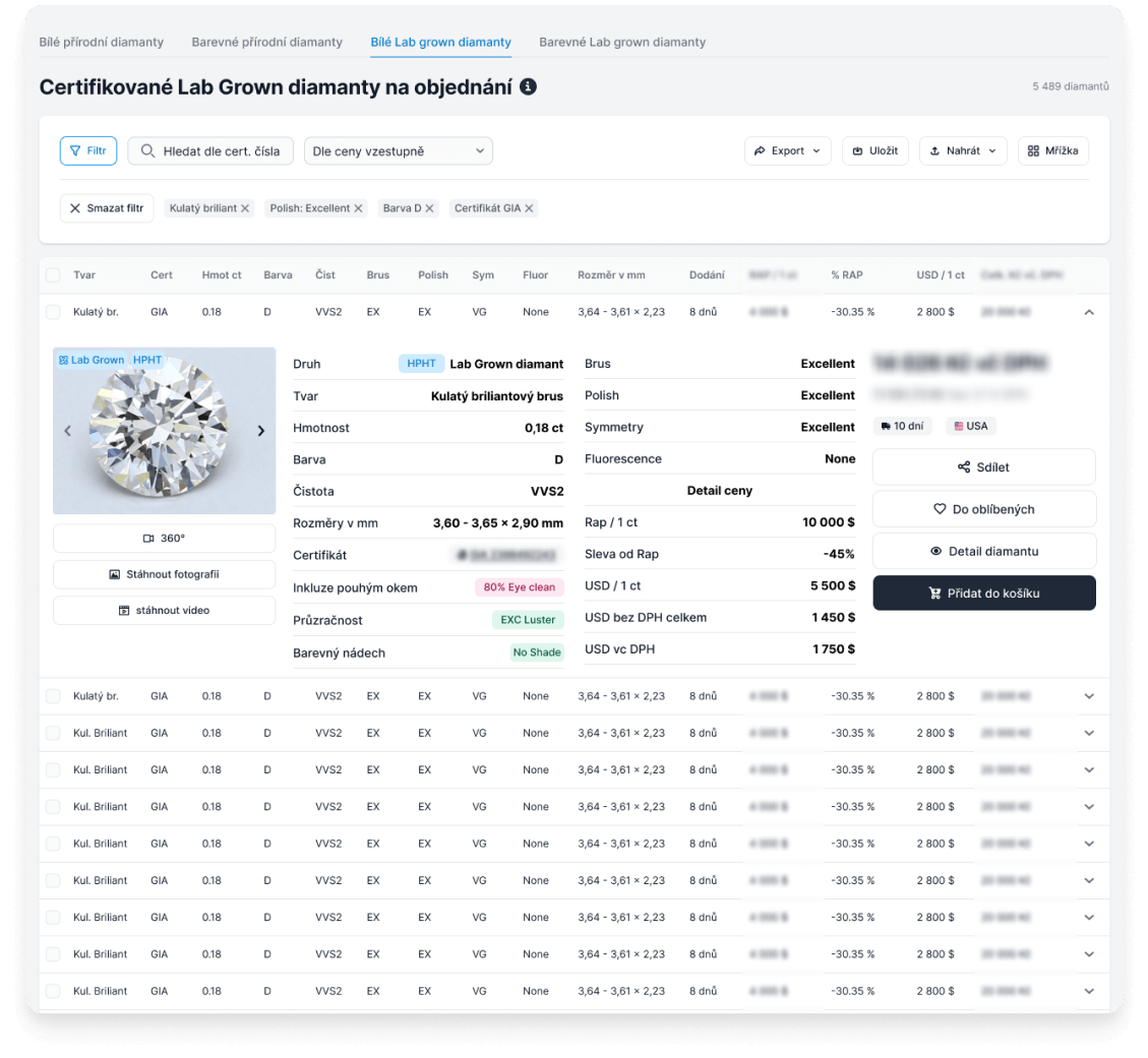 Registrierte Benutzer haben Zugriff auf die Preise kleiner und zertifizierter Diamanten und können auf unserem Marketplace zertifizierte natürliche und Labor-Diamanten aus der ganzen Welt bestellen.